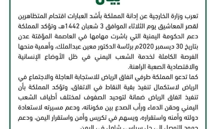 أعلنت الحكومة السعودية، الأربعاء، رسمياً إدانتها إقتحام أنصار المجلس الإنتقالي لمقر إقامة حكومة هادي بعدن.