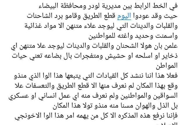 حذرت قبيلة آل دمان في مديرية لودر بمحافظة ابين في بيان لها قوات اللواء الثالث حماية رئاسية التابع لمليشيات الإخوان بقيادة لؤي الزامكي من نتائج قطع الطريق الرابط بين مديرية لودر ومحافظة البيضاء والذي يمر في مناطقها.
