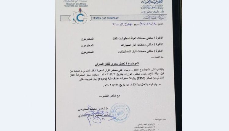 وكشفت وثيقة رسمية عن قيام السلطة المحلية التابعة للشرعية برفع سعر الغاز المنزلي بنسبة 60% في قرار من شأنه أن يضاعف الأعباء على المواطنين.