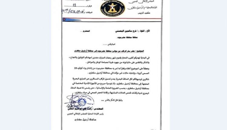 ووجه المجلس الإنتقالي التابع للإمارات بمنع دخول أي مسافرين من حضرموت والمهرة، بمبرر الحد من تفشي فيروس كورونا.