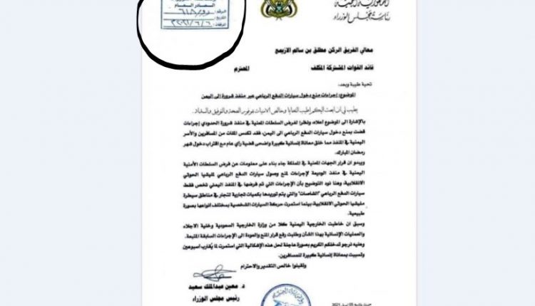 سرب ناشطون ووسائل إعلامية تابعة لحكومة هادي خطابا مزوراً من رئيس الحكومة معين عبدالملك، إلى قائد قوات التحالف المشتركة يطالب فيها السماح بعبور المغتربين اليمنيين المحتجزين في الجانب السعودي من منفذ الوديعة البري بسبب قرار منع دخول السيارات ذات الدفع الرباعي إلى اليمن.