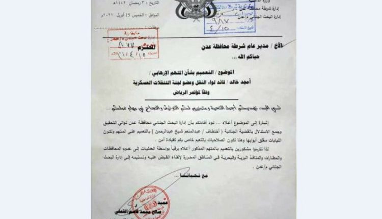 وطالبت المذكرة الصادرة عن البحث الجنائي في عدن – جنوبي اليمن – من مدير الشرطة التعميم إلى “جميع المحافظات والمطارات والمنافذ البرية والبحرية لإلقاء القبض” على قائد لواء النقل العميد أمجد خالد، وذلك غداة طلب المجلس الإنتقالي الجنوبي من التحالف بقيادة السعودية رفع الغطاء عن القائد العسكري البارز في القوات الرئاسية الحكومية.