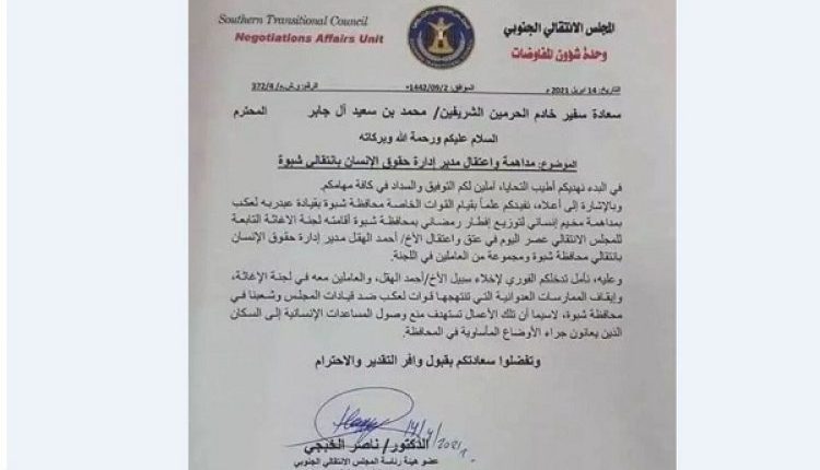 وقالت مذكرة الشكوى الذي وجهها القائم بأعمال رئيس المجلس الانتقالي ناصر الخبجي، أن قوات تابعة للأمن الخاص قامت بمداهمة مخيم توزيع إفطار رمضاني بمحافظة شبوة وإعتقال أحمد الهقل مدير إدارة حقوق الإنسان بانتقالي محافظة شبوة ومجموعة من العاملين باللجنة.