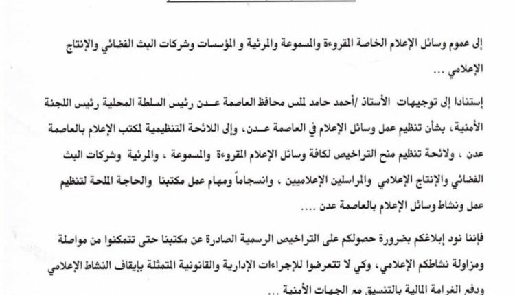 واصدرت السلطة عبر مكتب الإعلام في عدن تعميم بضرورة استصدار تصاريح عمل منه بدلاً عن وزارة إعلام هادي.