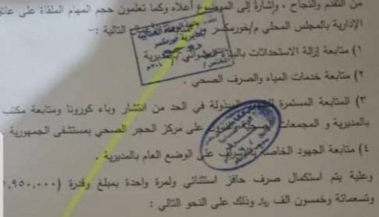وتشير إحدى الوثائق إلى توجيه سلطة الإنتقالي في مديرية خورمكسر بصرف 2 مليون حافز استثنائي لـ3 من قيادات السلطة المحلية في المديرية.