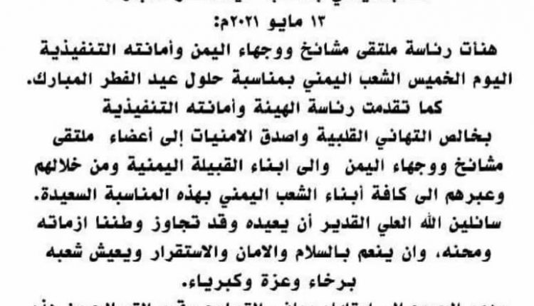 رئاسة ملتقى مشائخ ووجهاء اليمن وأمانته التنفيذية تهنئ الشعب اليمني بمناسبة عيد الفطر المبارك..!