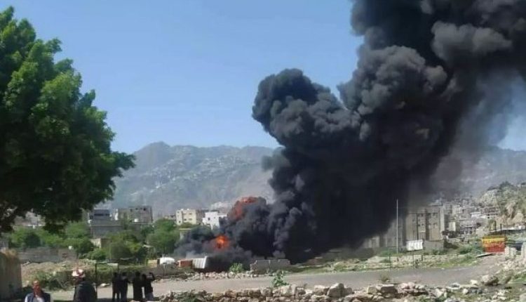 اندلع حريق هائل في محطة وقود، الأربعاء، في مدينة تعز الخاضعة لسيطرة قوات عسكرية تابعة لحزب الإصلاح.