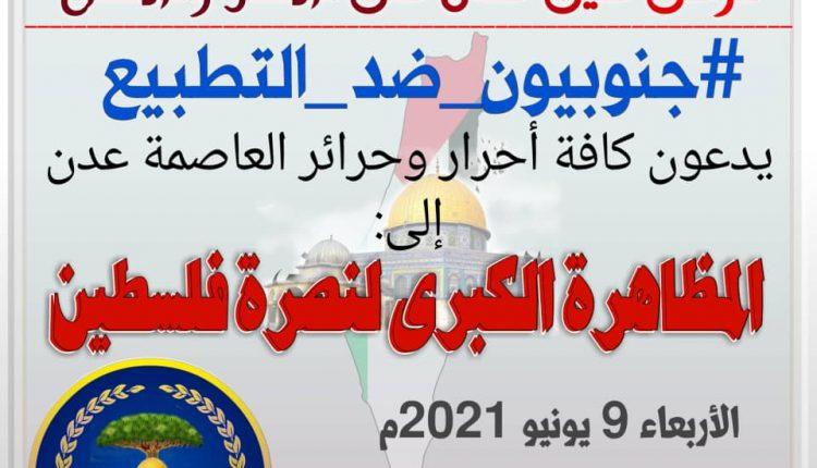 إحتفاءً بالنصر الفلسطيني العظيم ورفضاً للتطبيع.. مؤسسة “جنوبيون ضد التطبيع“ تدعو لحضور الفعالية الكبرى في العاصمة عدن..!