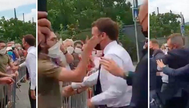 وحيا ماكرون الحاضرين الذين لم يفصله عنه سوى حاجز حديدي قصير لا يزيد عن متر، وعندما اقترب الرئيس ماكرون من الحشد أمسك شاب ساعده الأيمن وصرخ “تسقط الماكرونية”، ثم وجه صفعة قوية على خده الأيسر.
