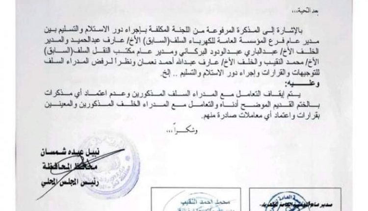 وأشار التعميم، إلى أن عبدالحميد والنقيب، رفضا إجراء دور الاستلام والتسليم مع المدراء الخلف وهما على التوالي عبدالباري عبدالودود البركاني، وعارف عبدالله أحمد نعمان.
