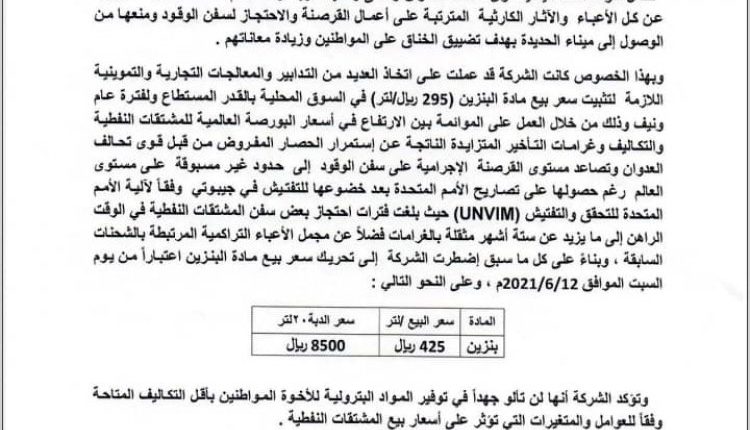 وقالت الشركة إنها مضطرة لبيع البنزين بتسعيرة جديدة تساوي 425 للتر الواحد، 8500 للعشرين لتر، فيما الدبة الديزل ب 7900 ريال.