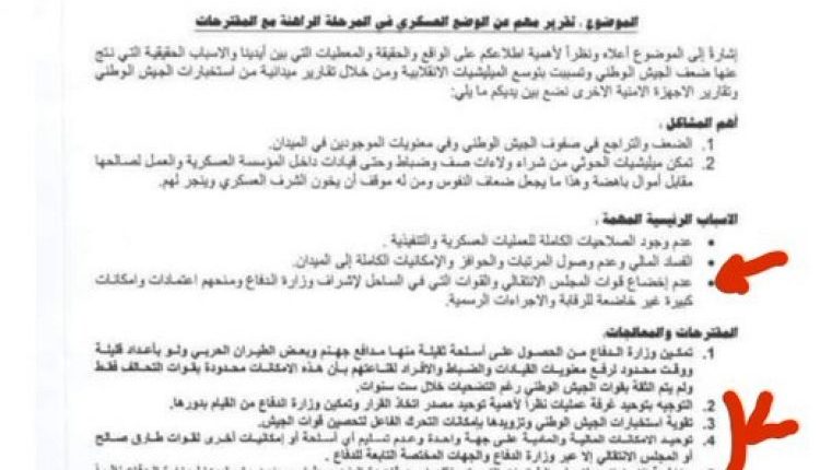 واعاد ناشطين ووسائل إعلام تابعة لهادي نشر تقرير وزير الدفاع محمد المقدشي الذي رفعه قبل أشهر كبرنامج لعمله كوزير للدفاع ويتضمن معلومات بشأن ترتيبات إماراتية لتعزيز قدرات الإنتقالي الجوية.