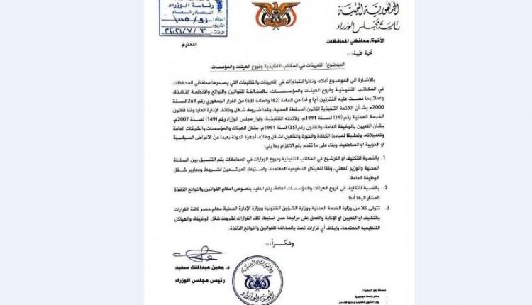 بعد ان كان الأخير قد أصدر قرارات تعيين تشمل عديد من المؤسسات والمرافق، وسط إستمرار الصراع بين هادي والإنتقالي للاستحواذ على المؤسسات الحكومية في مدينة عدن التي تتخذها الحكومة عاصمة لها.
