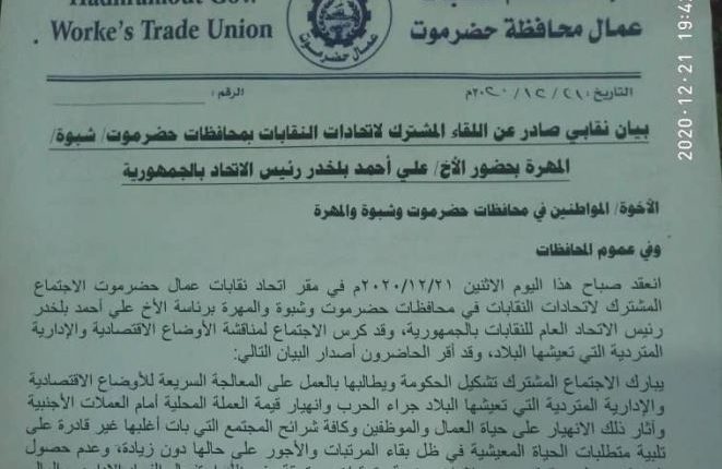 وطالب إجتماع مشترك لإتحاد النقابات العمالية في بيان له حكومة هادي وقف إنهيار العملة المحلية وتفعيل البنك المركزي، تحريك الأجور بما يتناسب مع إرتفاع أسعار الصرف، صرف العلاوات السنوية، وقف الاستقطاعات من المرتبات إلى جانب تفعيل الحوار الإجتماعي واللقاء باتحاد النقابات لتدارس الأوضاع.