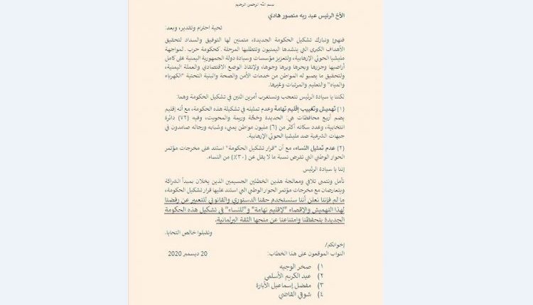 ووجه عدد من أعضاء مجلس النواب في كتلة حزب الاصلاح رسالة إلى الرئيس عبدربه منصور هادي الذي يقيم بصورة دائمة في الرياض، معلنين اعتراضهم على تشكيل الحكومة.