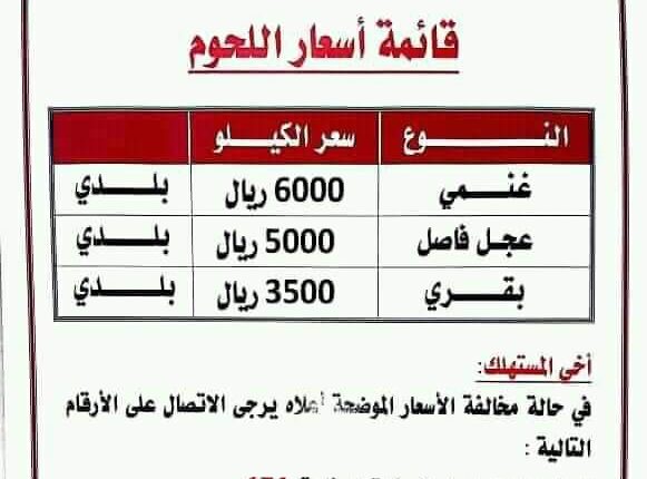 وحددت القائمة سعر الكيلو الغنمي بـ6000 ريال والعجل 5000 ريال والبقري 3500 ريال.