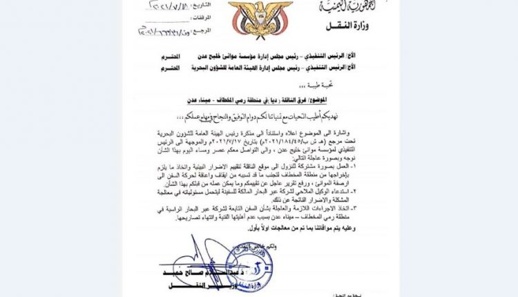 ووجه وزير النقل المقرب من رئيس المجلس الانتقالي عيدروس الزبيدي، بسرعة إخراج السفينة تجنباً لتسببها في إغلاق موانئ عدن.