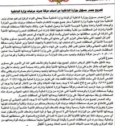 واعتبر البيان رفض صرف مرتبات الداخلية ضمن حرب تقودها أطراف لم تسميها في حكومة معين ضدها منذ عامين، ملمحة إلى وجود مخطط لتفكيك المنظومة الأمنية لها.