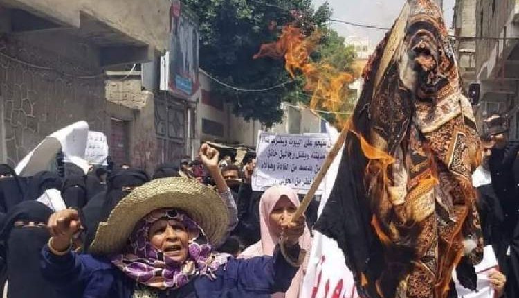 تظاهرة شعبية غاضبة.. والنساء تحرق خمائرهن أمام مقر قيادة محور تعز تنديداً بإبادة أسرة الحرق..!