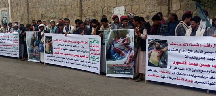 وناشد المحتجون قائد الثورة السيد القائد عبدالملك بدر الدين الحوثي وقيادة المجلس السياسي الأعلى ورئيس المنظومة العدلية محمد على الحوثي وكذلك وزير العدل التوجيه بسرعة تنفيذ حكم القصاص الشرعي على قتلة الشهيد الاشموري والصادر من محكمة غرب الامانة الابتدائية..