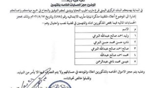 ونشرت وسائل اعلام تابعة للإصلاح صورة مذكرة من البنك المركزي في مأرب لكافة البنوك التجارية والحكومية بتجميد حسابات الـ5 ضباط متهمين بـ”النصب والاحتيال” في عدة ألوية عسكرية.