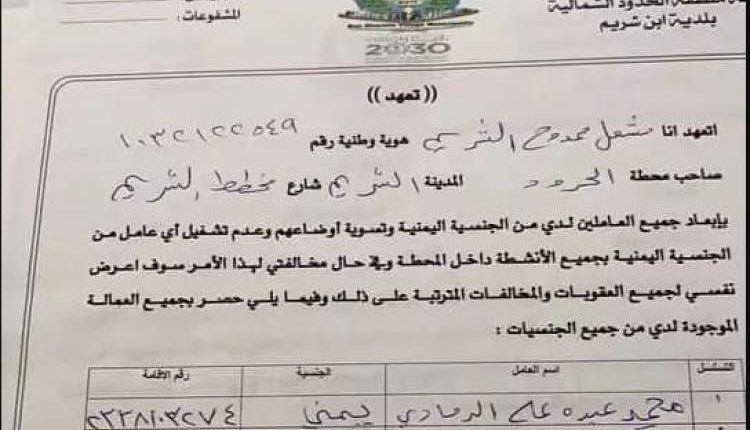 وتداول ناشطون تعهد من صاحب محطة في بلدية ابن شريم في منطقة الحدود الشمالية، بعدم تشغيل العمالة من الجنسية اليمنية.