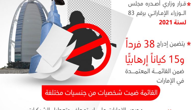 أعلنت الحكومة الاماراتية عن إدراج شخصيات وشركات يمنية في قائمة جديدة للإرهاب تضم 38 فرداً و15 كياناً من دول عدة.