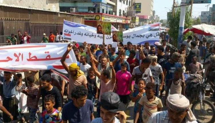 وحمل المتظاهرون الشرعية والتحالف مسؤولية إنهيار الأوضاع الاقتصادية في المدينة، مؤكدين أن التحالف، أشعل الحرب في اليمن وعليه أن يتحمل التبعات.