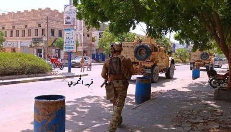 وشوهدت عربات مدرعة مع إنتشار لجنود بريطانيين وكلاب بوليسية في شوارع مدينة غيل بن يمين.