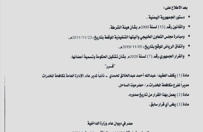 اصدر وزير الداخلية اللواء ابراهيم علي حيدان قرار تكليف العقيد/ عبدالله احمد عبدالخالق لحمدي نائباً لمدير عام الإدارة العامة لمكافحة المخدرات مديراً لفرع لمكافحة المخدرات م/ حضرموت الساحل .