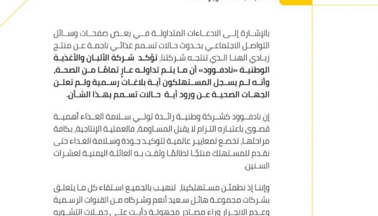 نفت شركة الألبان والأغذية الوطنية “نادفود” الشائعة المتداولة في بعض صفحات التواصل الاجتماعي بحدوث حالات تسمم غذائي ناجمة عن منتج “زبادي الهناء” الذي تنتجه الشركة.