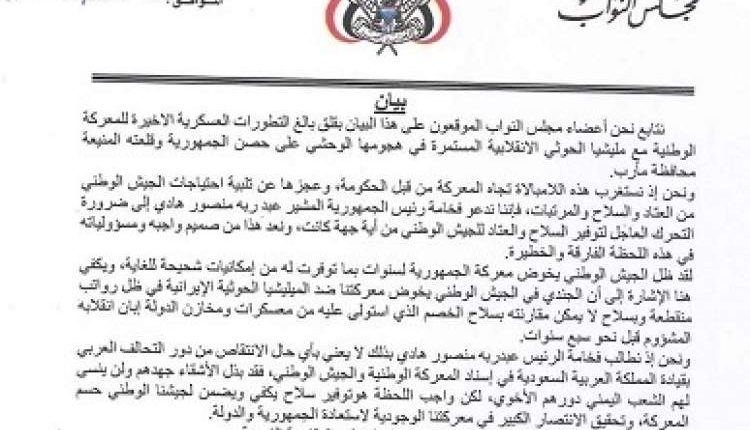 وقال 25 عضواً من أعضاء برلمان هادي، إن قواته “تخوض معارك في ظل رواتب متقطعة وعدم توفر أسلحة”، في إتهام صريح للتحالف بخذلان قواتهم.