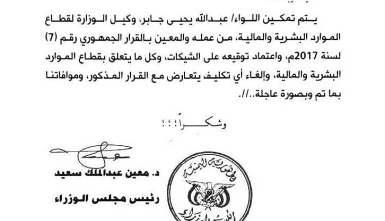 ورفض حيدان قرار لمعين يقضي بتمكين اللواء عبدالله يحي جابر من منصبه كوكيل لقطاع الموارد البشرية والمالية.