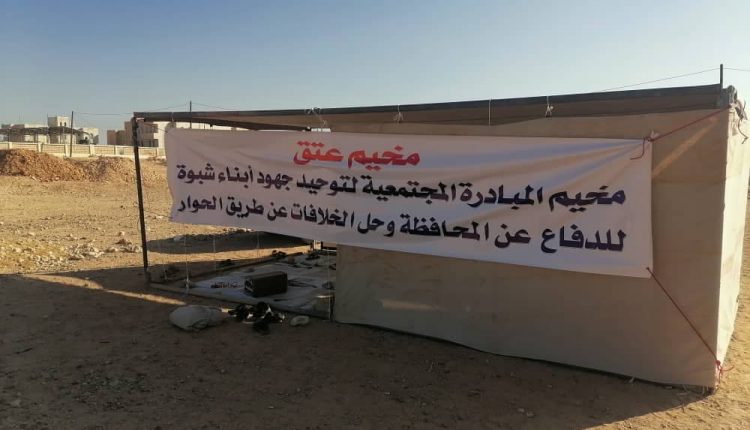 مخيم الاعتصام داخل مدينة عتق، تقول المصادر إنه كان من ضمن ما تقرر تنفيذه في الاجتماع القبلي الذي عقد في مديرية نصاب والذي دعا له الشيخ الوزير المدعوم من الإمارات.