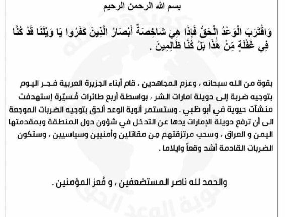 ونشرت حسابات الكترونية بياناً لالوية الوعد الحق العراقية، أعلنت تبنيها هجمات بأربع طائرات مسيرة أمس الأربعاء.