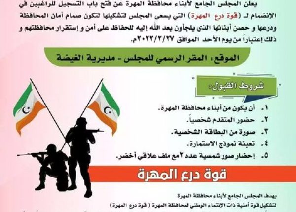 هذا التشكيل أعلن قبل يومين فتح باب التجنيد لأبناء المهرة بدوام جزئي وضمن الإعلان “الشرعية” واشار إلى أن القوة الجديدة التي لم يحدد قوامها ستكون رديفة لحفظ الأمن والاستقرار في المحافظة.