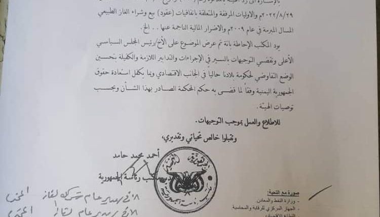وجهت الهيئة العليا لمكافحة الفساد في اليمن، الاثنين، مذكرة للمجلس السياسي، اعلى سلطة في صنعاء، تطالبه باتخاذ الإجراءات لاستعادة حقوق اليمن المنهوبة من الغاز المسال الذي تستحوذ عليه فرنسا.