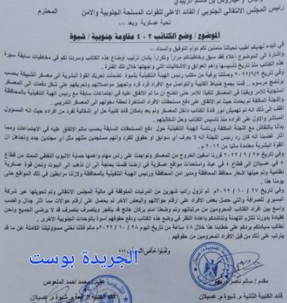 بعد تسريحها قسرياً وايقاف رواتبها.. كتائب للانتقالي تتوعد قيادته بقلب الأوضاع عليه في شبوة..!