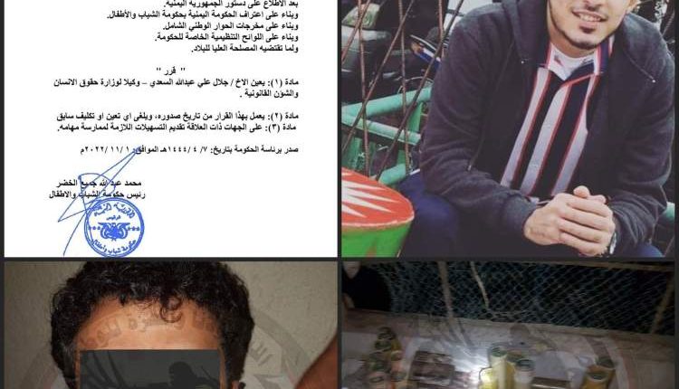 ونشر محمد بن فيصل مذكرة جديدة تقضي بتعيين جلال السعدي وكيلاً في حكومة الشباب والأطفال اليمنية التابعة للتحالف.