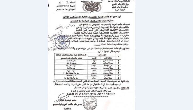فرضت السعودية وعبر برنامج إعادة الإعمار الذي يرأسه السفير محمد آل الجابر تسميات سعودية على عدد من المدارس في محافظة المهرة شرقي اليمن.