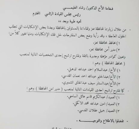 في خطوة تستهدف السيطرة على المدينة.. تحركات لإقالة محافظ تعز ومدير أمنها وتعيين موالين لطارق.. “وثيقة“..! On ديسمبر 9, 2022 3٬591 Share قراءة المزيد في خطوة تستهدف السيطرة على المدينة.. تحركات لإقالة محافظ تعز ومدير أمنها وتعيين موالين لطارق.. “وثيقة“..! 3٬591 Share FacebookTwitterGoogle+ReddItWhatsAppPinterestالبريد الإلكتروني