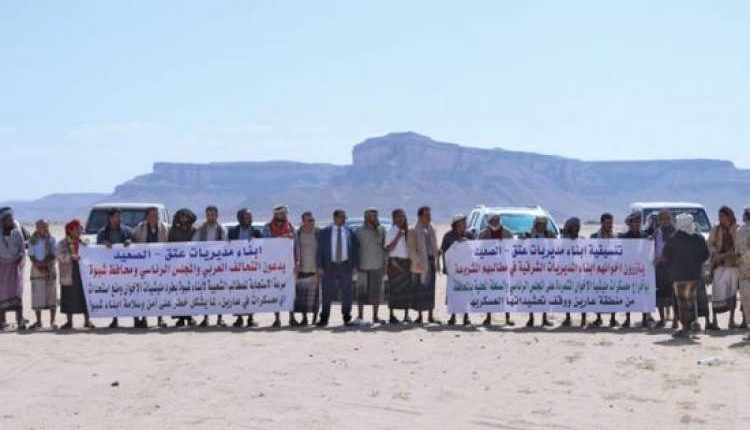 وقالت مصادر محلية إن مسلحين قبليين نفذوا وقفة احتجاجية في مديرية عرماء، شمالي المحافظة النفطية، للمطالبة بطرد مجاميع تابعة لقوات الأمن الخاصة المتمركزة في المديرية.