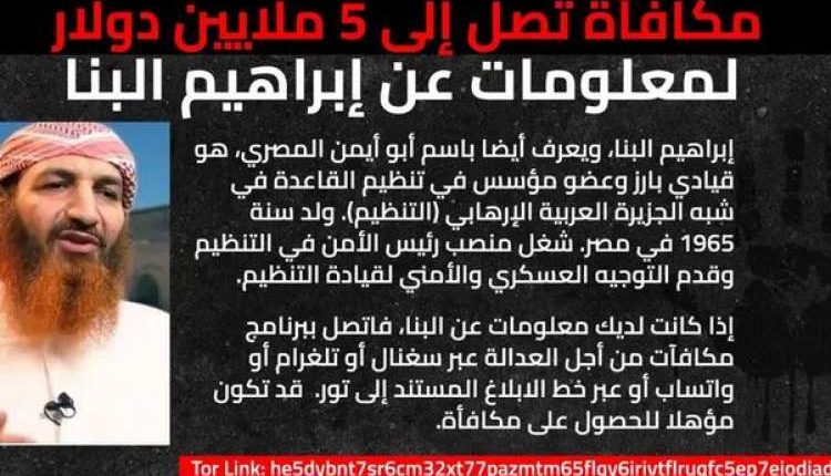 حيث أعلنت الولايات المتحدة الأميركية، الخميس، عن مكافأة مالية تصل إلى 5 ملايين دولار، مقابل الحصول على معلومات عن القيادي في تنظيم القاعدة باليمن المدعو إبراهيم البناء، والمعروف أيضاً باسم “أبو أيمن المصري”.