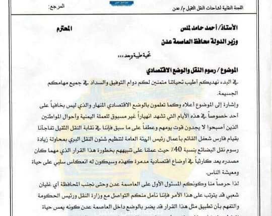 وطالبت قيادات الانتقالي في الهيئة لملس بالتدخل لدى وزير النقل وحكومة معين لمنع الرفع الجديد.