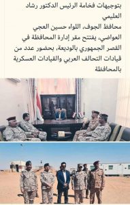 واللقاء عقد بالقصر الجمهوري بالوديعة والذي تم تحويله بقرار من رشاد العليمي إلى مجمع حكومي لمحافظة الجوف.