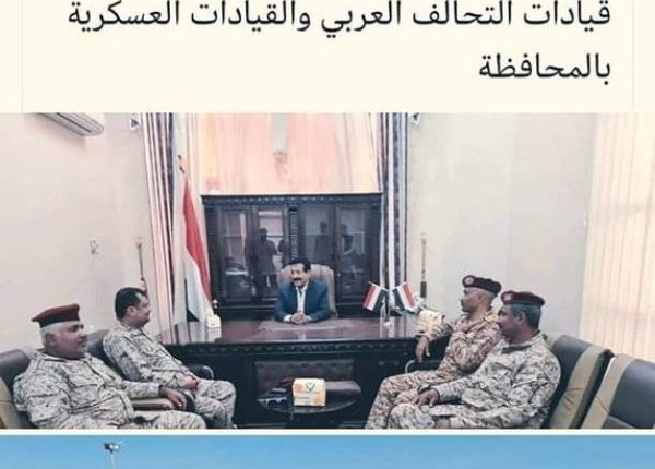 وأظهرت صور أول لقاء يجمع قائد قوات التحالف السعودي بحضرموت مع محافظ المؤتمر في الجوف حسين العجي العواضي.