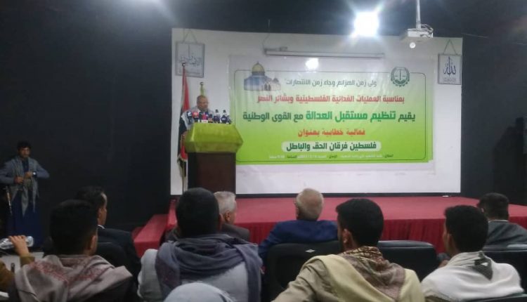 بمناسبة العمليات الفدائية الفلسطينية وبشائر النصر أقام تنظيم مستقبل العدالة مع القوى الوطنية فعالية خطابية بعنوان فلسطين فرقان الحق والباطل في قاعة الشهيد علي راشد الدهينة بمقر تنظيم مستقبل العدالة بصنعاء.