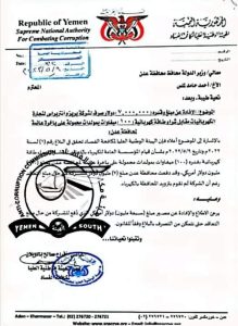 الوثيقة تضمنت مطالبة “الهيئة الوطنية العليا لمكافحة الفساد” لمحافظ عدن أحمد لملس، بالإفادة عن مصير المبلغ الذي تم التصرف به لصالح شركة أجنبية مقابل توريدها مولدات كهربائية على متن باخرة عائمة في ميناء عدن.