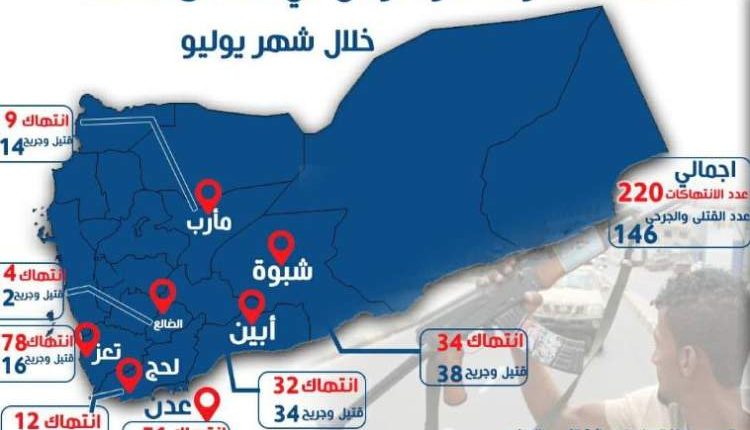 وأكد “مركز المعلومات في دائرة التوجيه المعنوي” بصنعاء، أن “الأرقام التي تم جمعها خلال الأشهر مايو -يونيو-يوليو لضحايا الانتهاكات في المناطق المحتلة تعكس مدى انهيار الأمن والسلم الاجتماعي في هذه المناطق ففي مايو تم تسجيل 121 قتيلاً وجريحاً نتيجة لأعمال الفوضى، وفي يونيو تم تسجيل 157 قتيلاً وجريحاً، وخلال يوليو تم تسجيل 146 قتيلاً وجريحاً، ليكون إجمالي القتلى والجرحى 424 قتيلاً وجريحاً، بمعدل 5 قتلى وجرحى يومياً”.