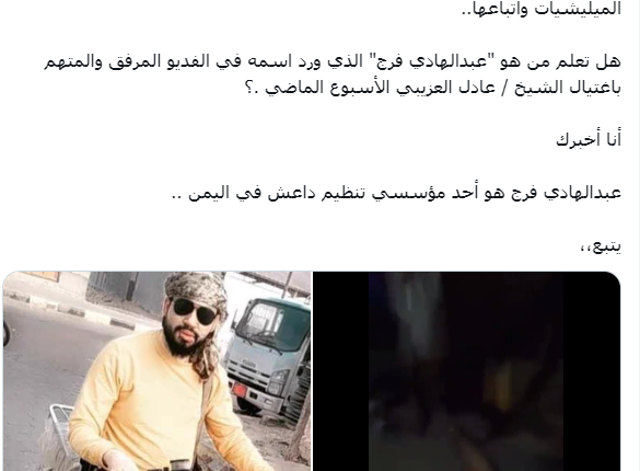 وواضح العريشي بأن “عبدالهادي فرج” الذي يشغل منصب قائد كتيبة بفصائل الانتقالي بلحج، يعد من أبرز مؤسسي تنظيم “داعش” في اليمن، مؤكداً اعتقاله من قبل الإمارات واحتجازه في سجن بئر احمد قبل نقله على متن طائرة خاصة إلى المكلا ومن ثم إعادته إلى عدن.